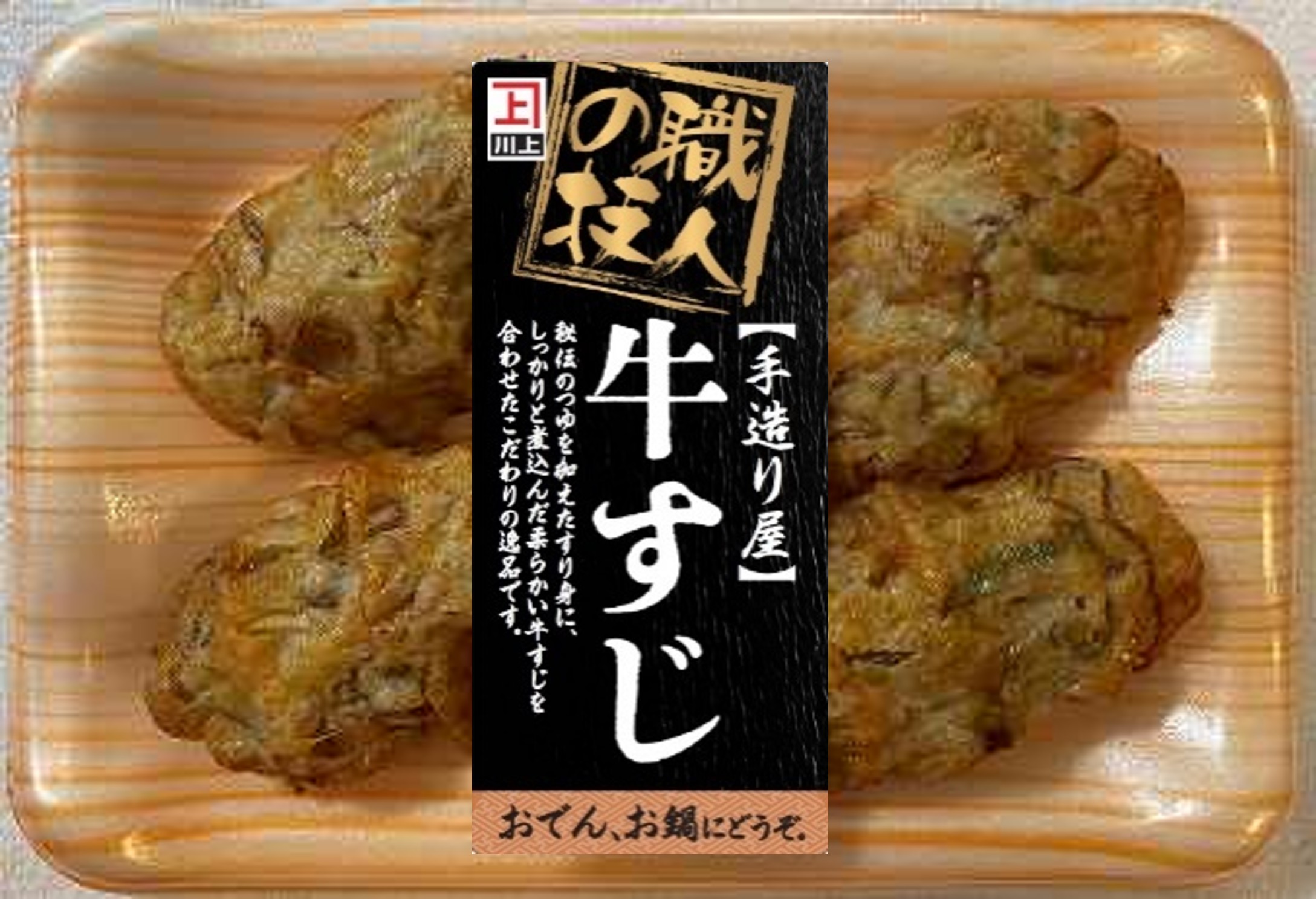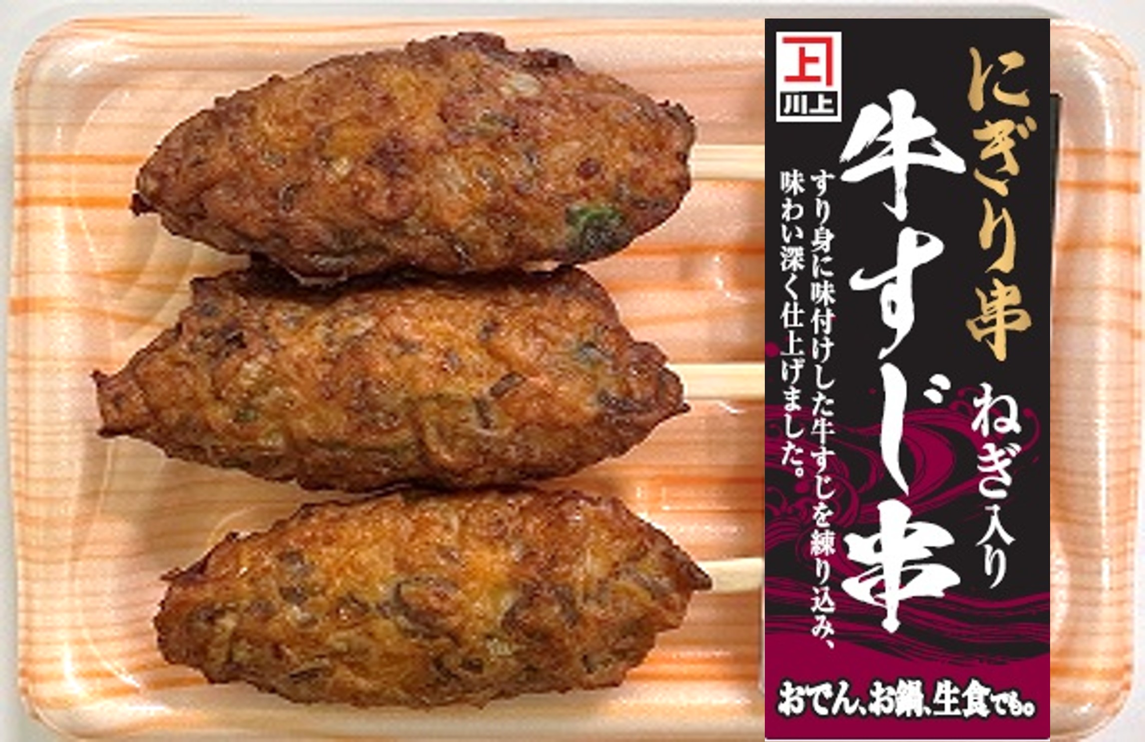 しっかりと味付けした柔らかい味付き『牛すじ』を練り込み、『ねぎ』を入れ彩り良く仕上げた串付きの商品です。