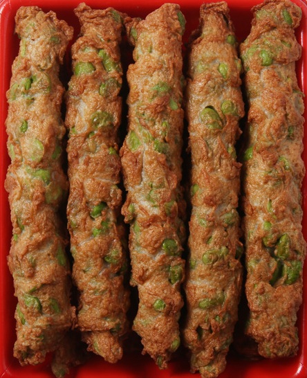 一味唐辛子がきいた枝豆入りのすり身をれんこんではさんで揚げた食感が楽しめる商品です。