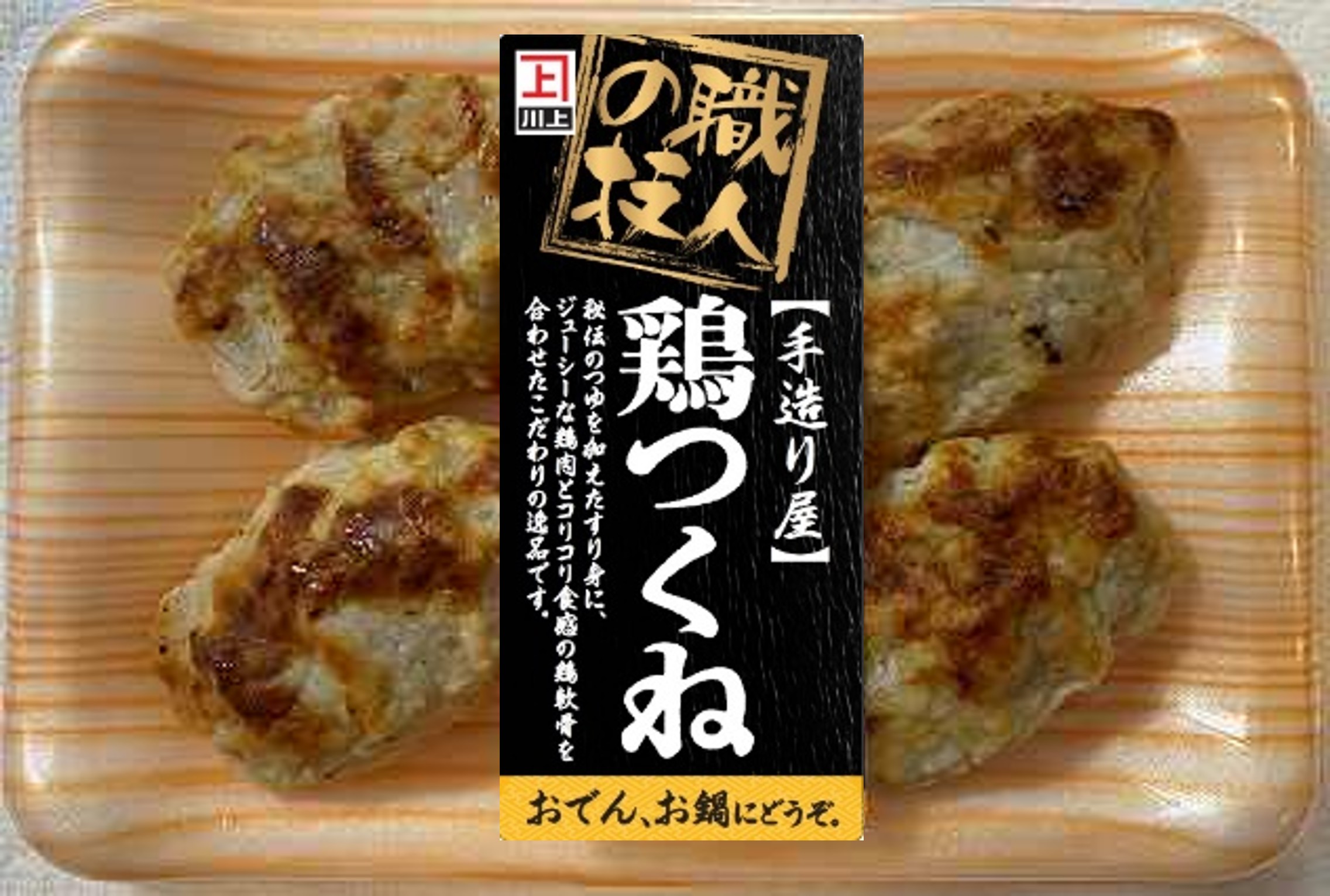 たっぷりと練り込んだ『鶏ミンチ』と『鶏皮』のジューシーさと、『鶏軟骨』のコリコリした食感が楽しめる串付きの商品です。